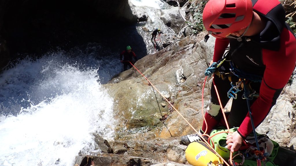 Un masque ? en canyon ? et oui ! On adore sauter dans les vasques ou profiter des toboggans naturels mais si tu ne vas pas voir ce qu’il y a sous l’eau avant de te lancer éperdument dans ta recherche d’adrénaline, tu risques d’avoir de mauvaises surprises ! Les vasques évoluent, elles s’engravent, se désengravent, les crues peuvent y apporter des troncs, ou des blocs. Donc : on envoie toujours quelqu’un vérifier la profondeur et l’absence d’obstacles !