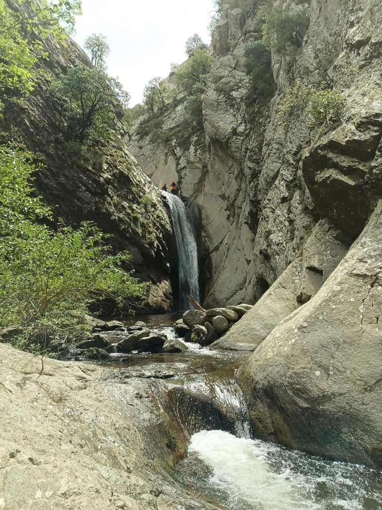 Parcours : On débute par une courte marche dans le cours d’eau qui nous amène. On a un premier rappel obligatoire équipé en chainé en RG. Il n’y a pas de fond dans la première vasque. S’en suit un premier ressaut à contourner ainsi qu’un second qui passe en petit toboggan. A partir de là, on lance les hostilités avec un premier C15 pouvant se finir en T en réglant la corde courte. Equipé sur les 2 rives, on peut descendre dans ou en dehors de l’eau. L’accès au relai RG nécessite de la prudence car la vasque est déversante. Puis un SP6 ou un SP9 auxquels on accède par une MC en RG. S’en suit un T7 puis un petit ressaut et un T3. Dans une vasque un peu plus loin il y a le fameux brise tibia à ne pas faire en toboggan !! S’en suit un bel enchaînement de toboggans. On observera de la prudence sur le toboggan de la machine à laver qui peut présenter un puissant rappel d’eau. On notera également la présence d’un toboggan éjectable. On arrive sur un dernier rappel de 15m équipé en RG qui après lequel s’enchaîne trois toboggans successifs. Puis au choix dans une cascade qui fait un virage sur la gauche, soit un rappel/toboggan soit on passe rive gauche pour accéder à un saut dans une petite vasque. On termine par un dernier petit toboggan.