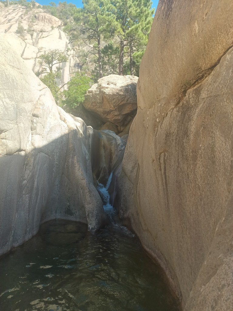 Parcours : Départ de la C30, un relai sur un bloc en RG. Le rappel est en plan incliné glissant, on peut le faire prendre en mode toboggan pour le côté ludique. Toujours pour le côté ludique, possible passage sous un bloc après le rappel. S’en suit un bel enchaînement de toboggan de plusieurs dimensions dont un « final » de 15m. Les plans inclinés atterrissent dans de belles vasques translucides. On arrive alors sur la C45. Une MC en RG nous emmène au relai normé sur broche. Un fractionnement est possible mais non obligatoire. La cascade zigzag un peu et comme partout sur le canyon, nous pouvons également le prendre assis pour rappeler un toboggan. On arrive alors à une petite étroiture par laquelle on accède grâce à une C3 équipée en RG. Le petit passage sinueux débouche sur un SP3 avec vu sur un bel enchaînement de TP. Le premier, un TP10, est en deux « parties », il descend, remonte un peu, puis plonge dans une belle vasque. S’en suit 2 petits toboggans qui permettent d’accéder au sommet de la C40. Equipée au sol en RD avec MC, la descente commence par un plan très incliné puis devient complétement vertical. Bien que large, la vasque d’arrivée n’est pas très profonde. La fin du canyon arrive après une C7, un TP et une nouvelle C7. On poursuit légèrement dans le court d’eau et la fin du canyon est marqué au milieu entre les arbres.