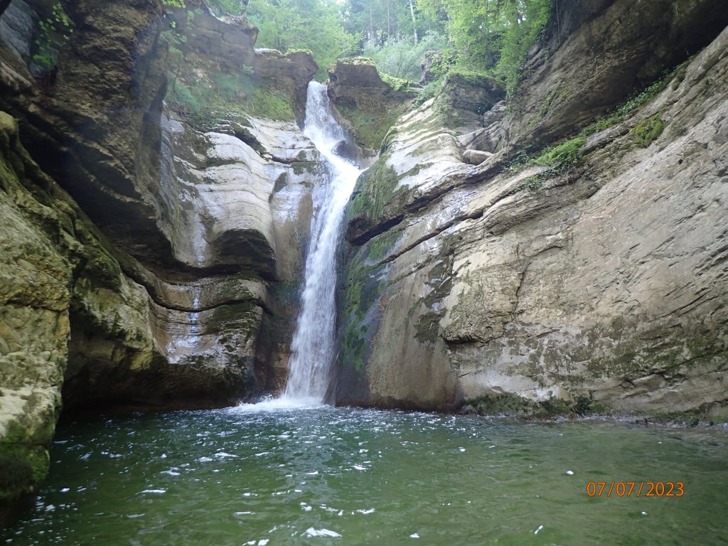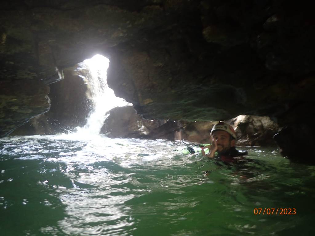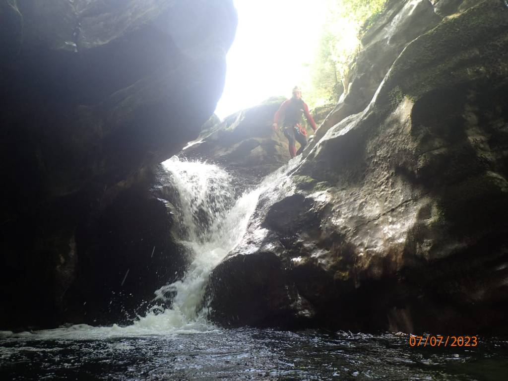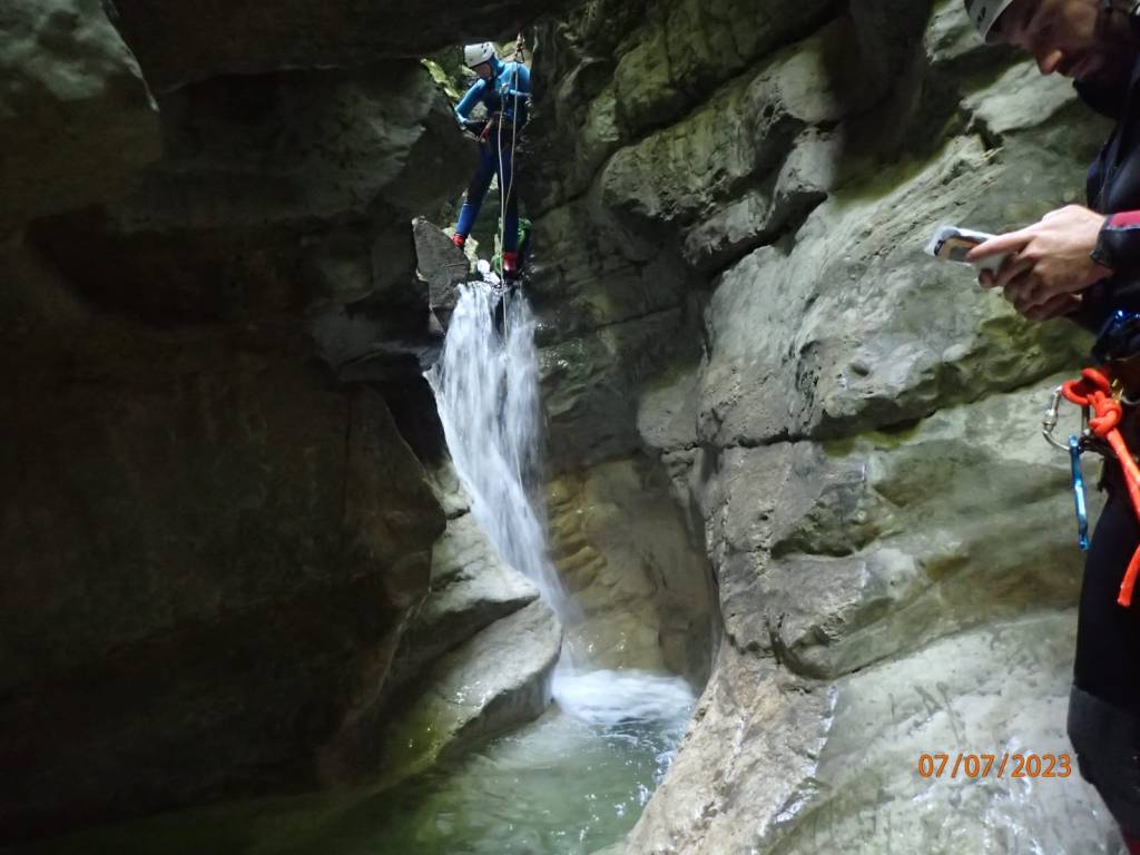 Parcours : On commence par une C20 qui coupe le cours d’eau. Le relai chainé se situe juste en face de la cascade principale. Un second relai (corde) est plus à droite sur un arbre. Alternative à la C20 en redescendant légèrement RG on trouve de quoi équiper un rappel de 15m ou alors différentes options de SP. Au bout de la longue et large vasque d’arrivée, on trouve une C10 équipée RD pour passer dans l’actif ou alors RG au bout d’une MC. Relai chainé. Nous sommes alors dans un encaissement assez étroit qui serpente de manière relativement horizontale jusqu’à une C4. On pourra remarquer les anciens points très haut sur la falaise. Pas de difficulté particulière sur cette petite équipée en RG. Progression dans l’étroit. On comprend qu’en cas de GD ce canyon est d’un niveau technique élevé. On notera un tronc coincé qui pourrait être siphonnant. Une petite C2 avec points en RG marque la fin des obstacles du premier encaissement. Le canyon s’ouvre petit à petit et après une courte marche on arrive sur l’échappatoire en RG signalé par une marque bleue suivant un sentier net. La seconde partie bien plus ouverte commence par un SP2 qui nous amène en haut d’une C4/SP4 (relai chainé en RG – SP précis en RD ou long en RG). La progression continue sous une belle arche naturelle qui pourrait être piège en cas de GD à cause des mouvements d’eau. Nouvelle belle progression qui nous amène à une C5/SP5 équipée RD sur la vire. La seconde partie se termine un peu plus loin. Nouvelle échappatoire en RG avec un chemin marqué de bleu. Puis, on s’engouffre dans la troisième partie soit par une nage en bief soit par un SP5 RG. Le saut doit se faire dans le bief étroit car le fond de la vasque en face remonte rapidement. La progression nous amène sur une MC puis SP2 puis à une C5 équipée en RG avec possibilité de passage hors d’eau sur la vire en RD (chaine). Nous sommes à nouveau dans une belle étroiture. On escalade une souche bloquée pour suivre le cours d’eau. On poursuit en désescaladant un peu mais l’étroit reste relativement horizontale. Le canyon se termine à la fin de l’encaissement et on remontera par un troisième et dernier chemin marqué de bleu en RG.