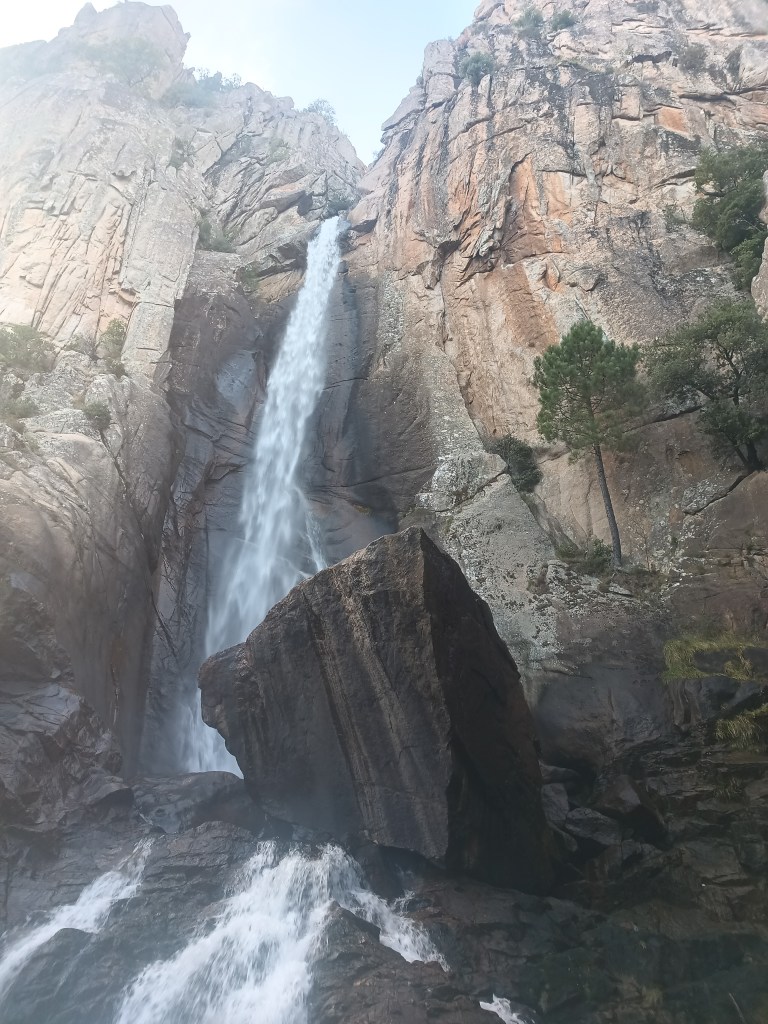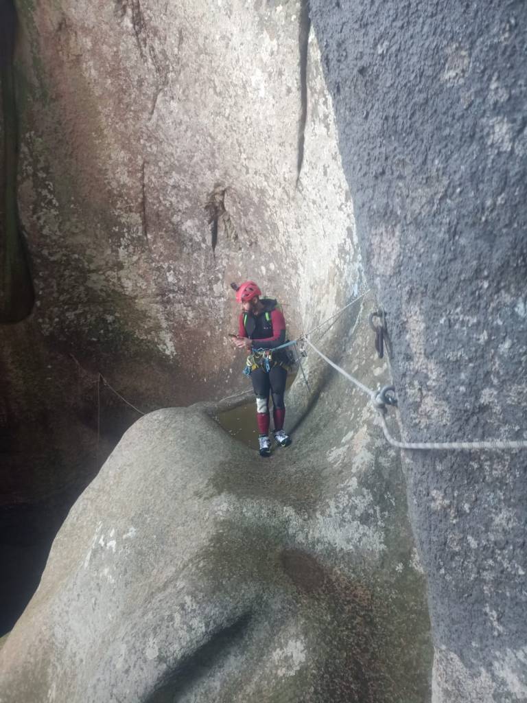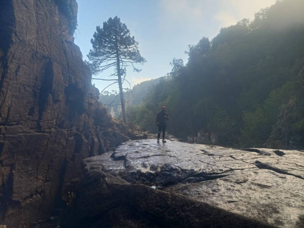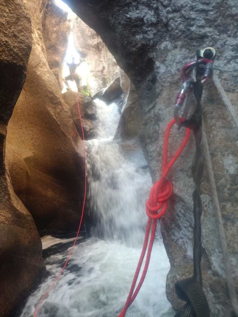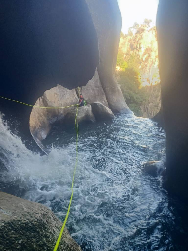Parcours : Le début est une petite marche en rivière d’environ 20min. Un peu de nage, de désescalade et de marche nous permettent d’arriver à l’entrée de l’étroiture. On débute avec une double C2 à passer en un seul relai équipée RD par 2 spits reliés corde. Après la vasque de la seconde C2, on enchaine sur une C6 à équiper en RG, par 2 points reliés par une corde. On peut shunter cet obstacle en RG qui nous amène à un C10/SP10. La C6 suivante est équipée par une corde d’accès à nœud ainsi que d’un relai chainé RD, nous amène dans une vasque avec un bloc quasi sous le rappel. Ce bloc nous protège du courant et nous aide à accéder facilement à la MC fixe en RD. Cette MC nous emmène sur une C8 en PI équipée à la suite de la MC. Points douteux. Elle nous amène au C7/T7 dernière obstacle avant la grande verticale. Plusieurs possibilités pour cet obstacle. Un T7, une C7 sur la vire en RD et une C3 complètement sur la droite au bout de la vire. Une MC en fixe peut être présente. Nous sommes alors sur le « crux » du canyon. Le rappel avec une large vasque déversante avec un bon courant à traverser pour aller chercher les points de MC en RG. Les points sont 3 mètres avant la C55 derrière deux gros blocs qui nous protège du courant. De la on progresse sur cette vire puis la MC continue en RD Plein gaz sur 5m environ pour arriver au relai. Bien faire attention à l’état des MC fixe. Ne pas hésitez en cas de doute à poser sa propre MC. On est alors sur le dernier rappel magnifique, hors d’eau et heureusement, ça peut pousser fort. 60m plus bas, on pose les pieds sur des éboulis très très glissants. Il faut faire une désescalade glissante d’environ 15m. Attention !