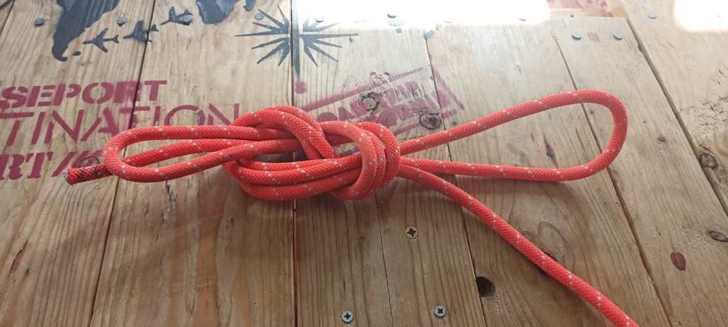 C’est comme un 8 de plein point avec plusieurs brins, l’idée est que le nœud soit suffisamment gros pour ne pas passer dans le descendeur.