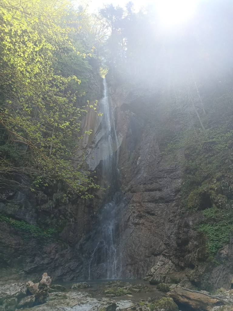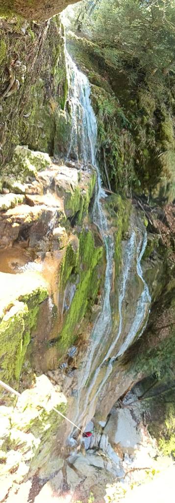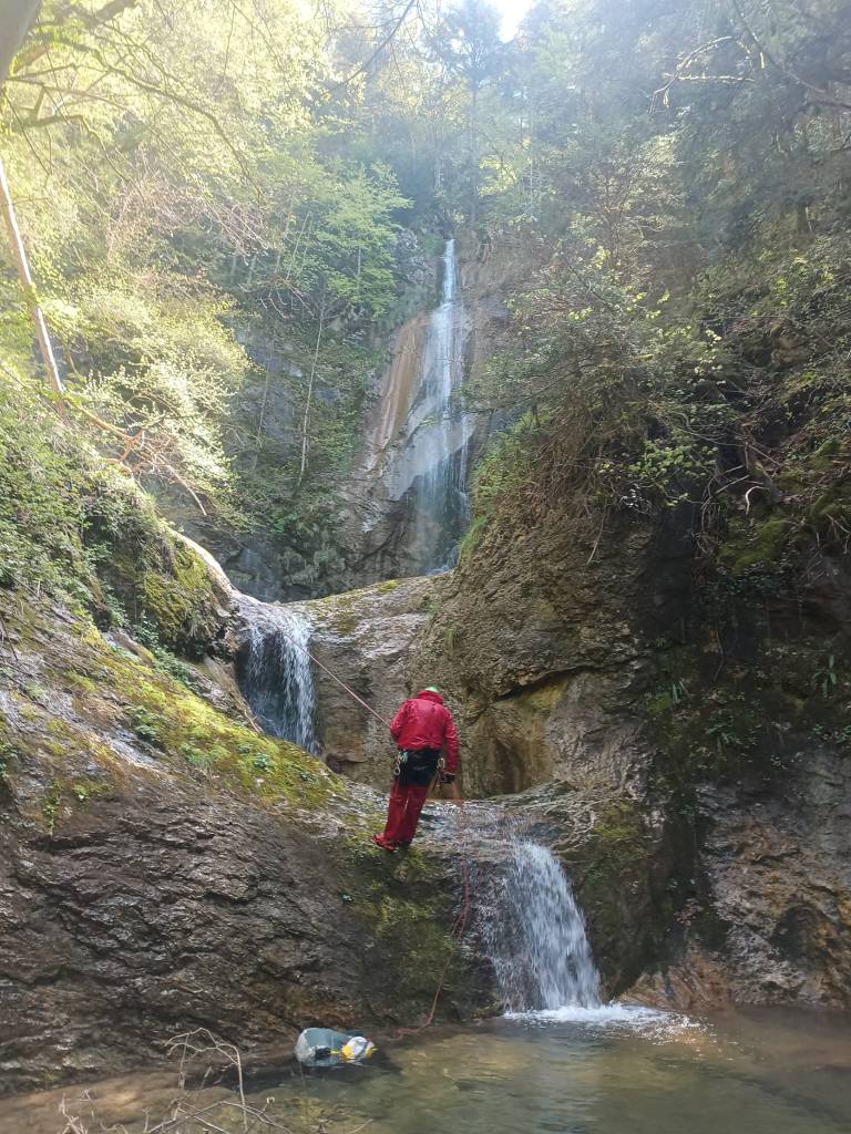 Parcours : On commence avec une par un petit rappel de 6m environ équipé en RG. S’en suit une succession de petits ressauts à désescalader avant d’arriver sur un joli enchainement de verticale. Une C16 équipée en RD nous emmène sur un arbre en RD également équipé textile et câble avec maillon rapide. De ce rappel, on part pour une C27 qui termine dans une vasque peu profonde. 2 points en RD reliés textiles nous permettent de descendre une C12. Fin de l’enchainement. Un peu de marche nous amène à un petit encaissement ou les rappels s’enchaînent. Des points de MC sont présents quand nécessaire. On arrive à la dernière grande verticale. Une MC suivi d’une C6 RD qui arrive dans une vasque suspendue qui amène à la C41. Cette dernière est équipée RG sur 4 spits solides et 1 piton relié chaine et textile. Cette belle verticale se termine dans une vasque large et peu profonde. On termine par 2 C10 équipées RD reliés textile.