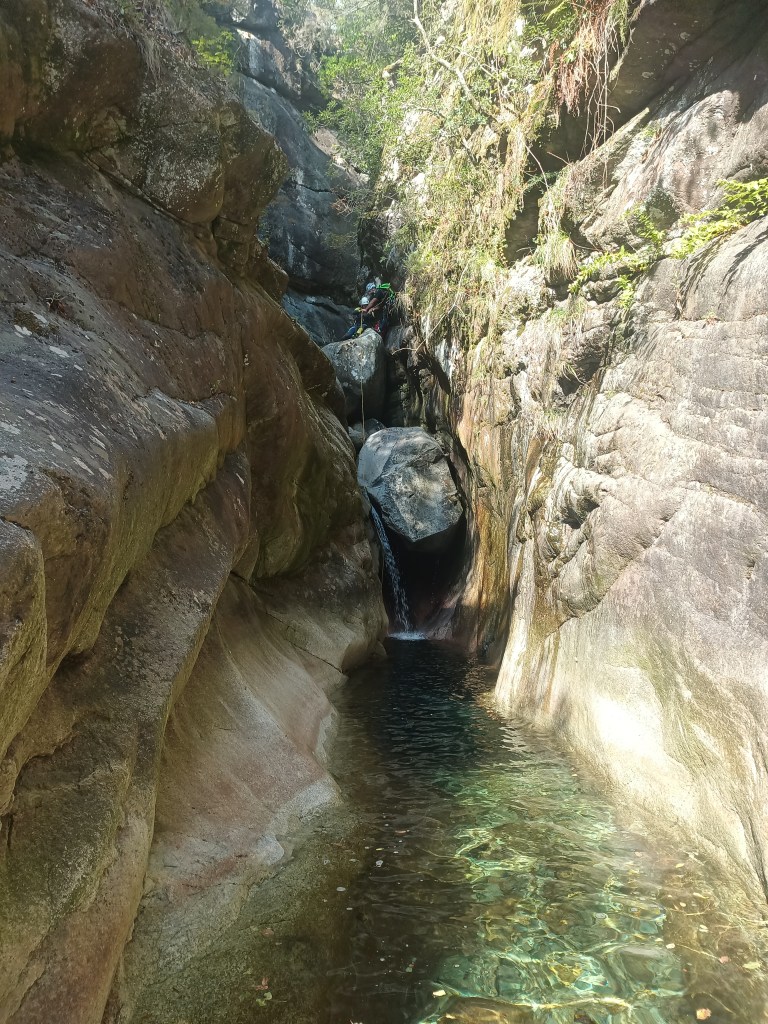 Approche : 60min : Marcher jusqu’au belvédère puis prendre une sente de sanglier sur la droite. Au niveau de la bifurcation, une trace bleu se trouve sur une pierre. Continuer cette sente jusqu’à arriver au cours d’eau. On saute dans les combinaisons néoprènes sous une végétation dense !