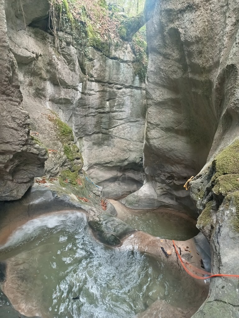 Parcours : Après une courte marche, on désescalade un petit ressaut juste sous le pont. Une dizaine de mètre plus loin, la première cascade, C10, est équipé en anneau de corde sur un arbre RD. Elle permet d’atteindre une succession de 6 petits obstacles majoritairement équipées RD dans un décors étroit et joliment sculpté.