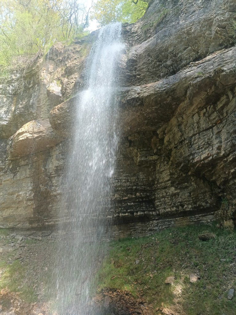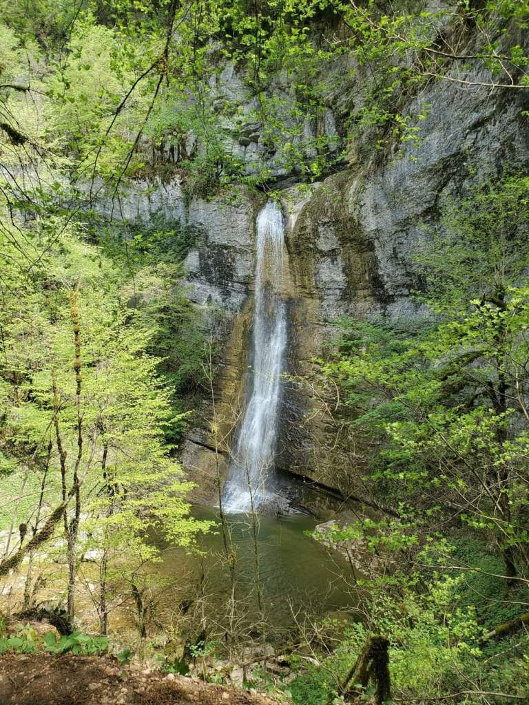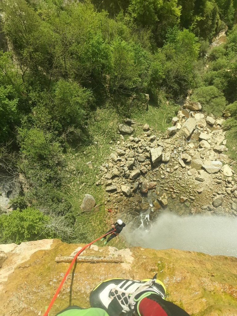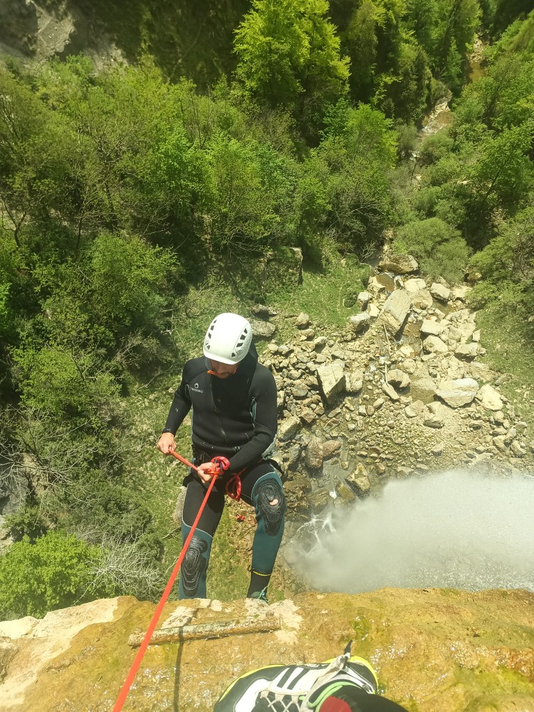 Parcours : On commence par une marche en rivière on esquive les barbelés tendus en travers pour guider le bétail, on passe sous un ancien pont et on arrive rapidement à la première C25. Le relai chainé se situe RG, un frottement de niveau 2/3 est à gérer ici. On marche à nouveau dans le cours d’eau au milieu des arbres en esquivant encore quelques barbelés jusqu’à ce que les arbres laissent place à la vue époustouflante du cirque. Le relai chainé se trouve en RG, il est accessible en tirant une petite main courante depuis un arbre. On est au premier relai de la C70, il faut préparer une quinzaine de mètre de corde pour atteindre le second relai qui se situe légèrement à RD de la ligne de rappel. Ce relai est également chainé permet une belle descente en rappel en fil d’araignée. Un bout de tuyau est installé sur la vire sous le relai pour éviter le frottement. L’arrivée du rappel se fait dans des blocs. On les désescalade puis on poursuit une vingtaine de mètre en RG pour retrouver le cours d’eau et 2 points de MC pour atteindre le prochain relai (chainé en RG) de la C20 suivante . Au pied du relai, il y a une broche sciée pour y passer la corde et ainsi éviter le frottement. Le dernier doit descendre à double ou alors il faut effectuer le rappel de corde depuis la RD de la vasque d’arrivée. Fin de la première partie. On continue un peu par le chemin en direction du parking aval et retourner dans le cours d’eau avant l’encaissement. 2 points non reliées en RD nous permettent de descendre dans la première vasque. Pour la suite de la partie aval, on est plus sur de la rando aqua avec de nombreuses possibilités de saut dans des vasques ou des trous d’eau sur le chemin. on notera un joli SP8 sur le parcours. Une petite C4 avec deux points non relié nous amène, après une petite marche/désescalade, à la dernière cascade, une C25 équipée par une longue MC en fixe ainsi qu’avec un relai chainé.