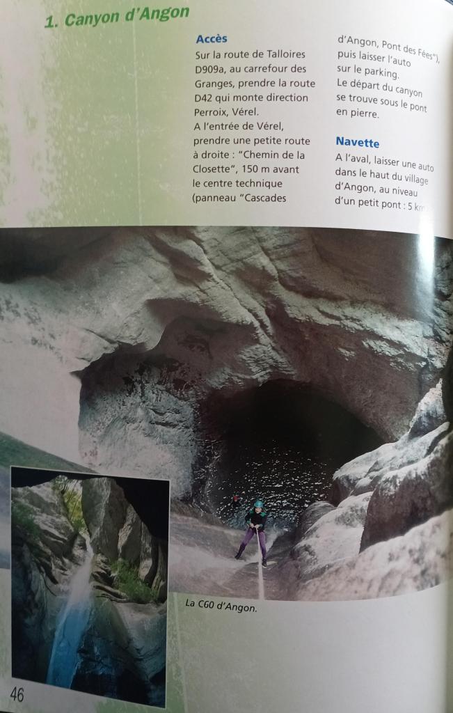 Pour expliquer la lecture d’un topo (et tu vas voir, c’est franchement pas sorcier), nous nous aiderons des images ci-dessous qui représente le canyon d’Angon (extraite du topo des « Canyons de Haute-Savoie 2ème édition »).