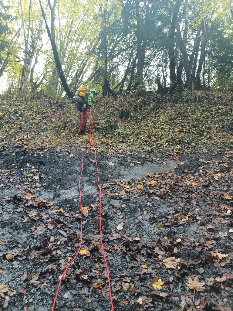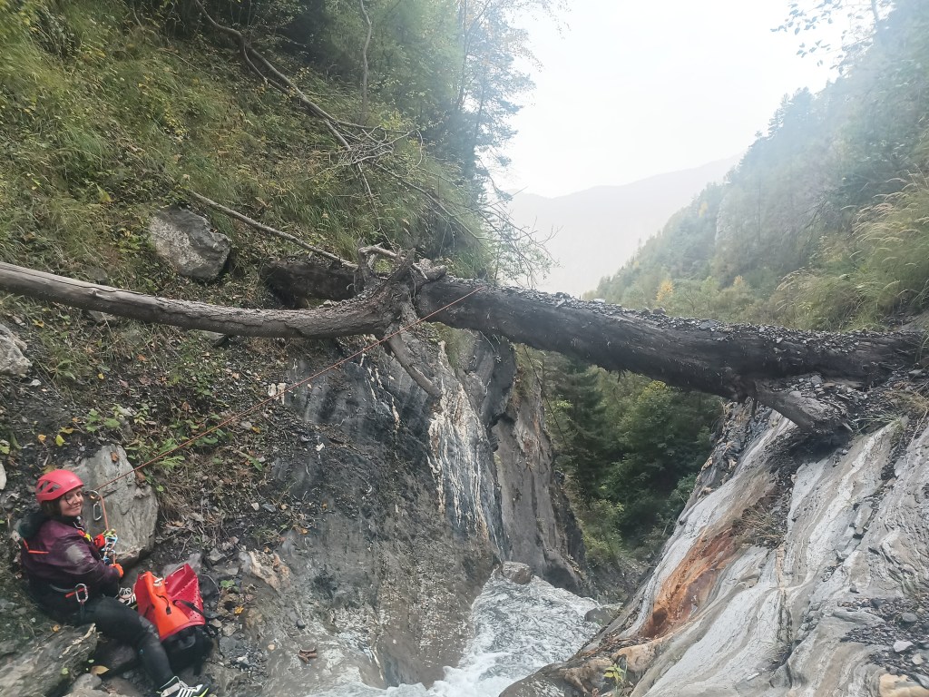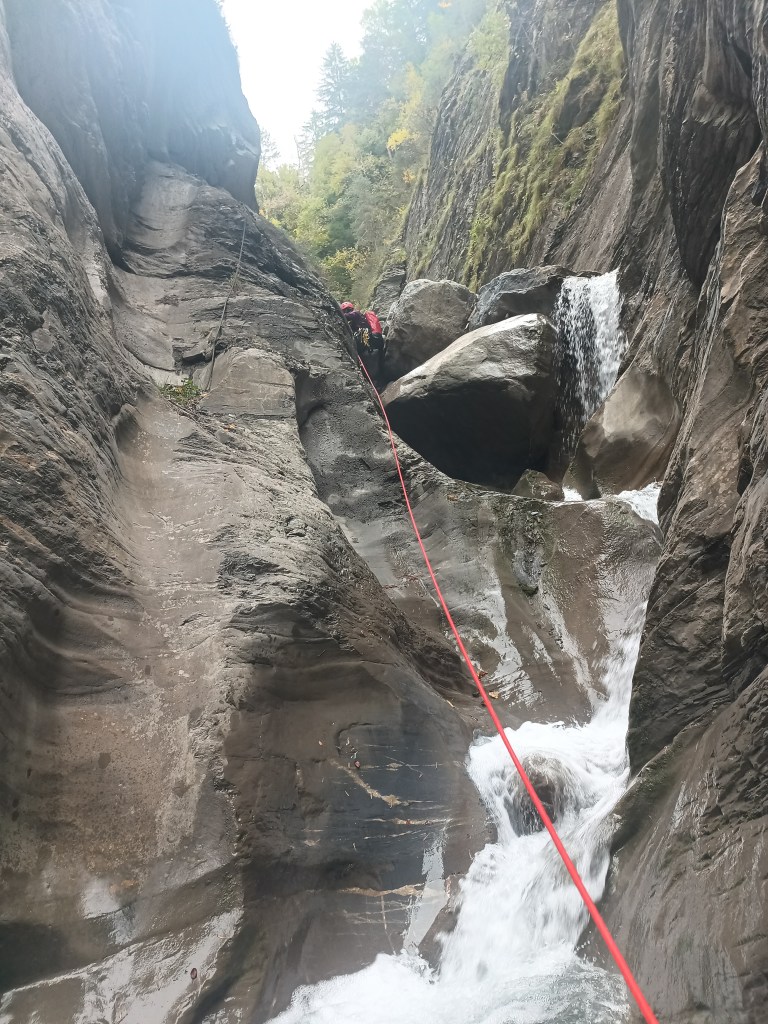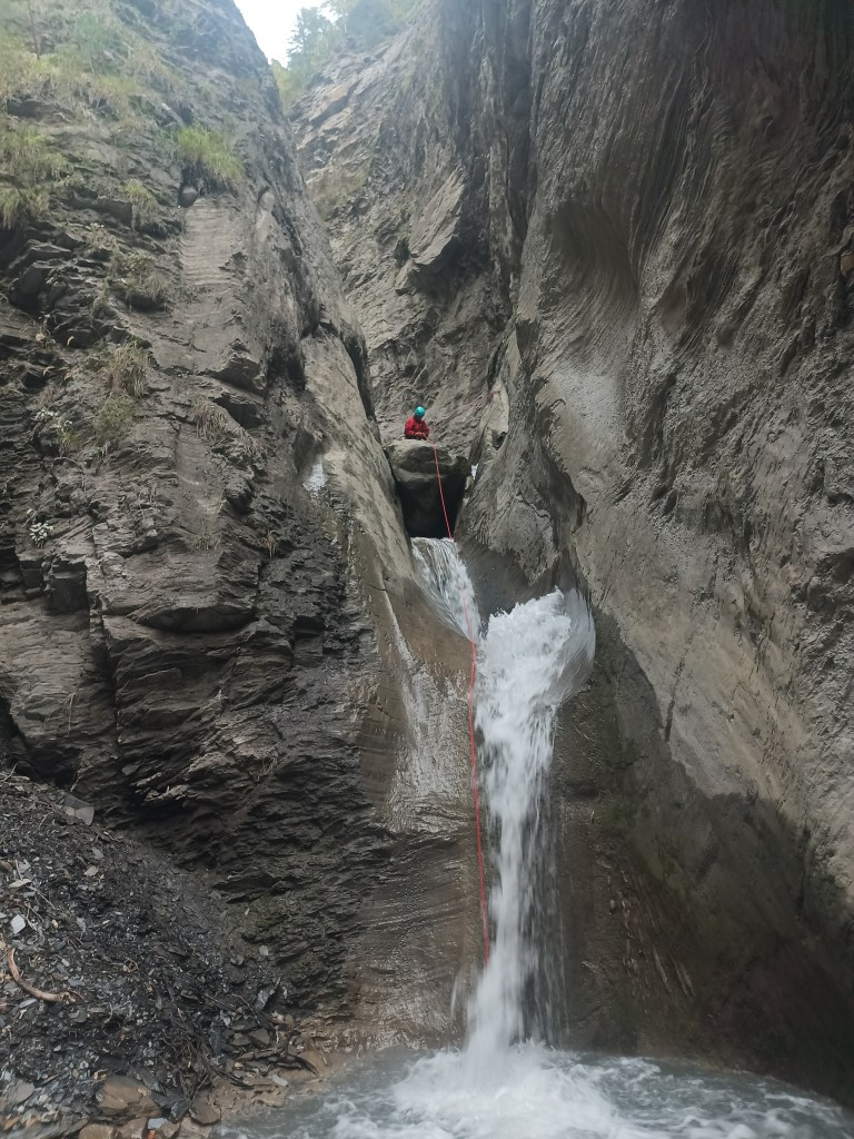 Parcours : On démarre donc par un rappel depuis les arbres d’une vingtaine de mètre. Après une première C10 équipée sur un bloc au milieu, on accède à une seconde équipée en RD avec des points assez haut. Viens ensuite la C65 équipée en RD avec un relai chaîné vieillissant. S’en suit une C11, C25, C7 qu’il faut descendre d’une traite par manque de relai. S’en suit une C10 équipée en RD par un relai chainé d’un autre temps … Changer le relai est plus que nécessaire. Une succession de petite cascade nous emmène en haut de la C41 équipée RG. Une C15, une C6, R6, R2 et une petite marche nous conduisent au brise-charge duquel on descend par une C13. Pour finir, on passe une double cascade pour un équivalent de C22.